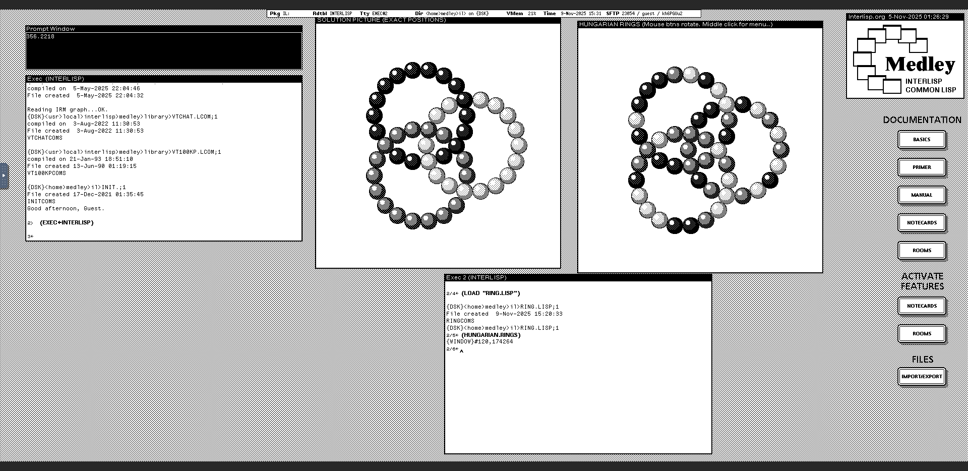 This is a variation on the Hungarian Rings puzzle written in Interlisp for the Medley Interlisp system. I'm including the "RING.LISP" source file. (Which you don't generally manually edit in Medley so the formatting is a bit nutty as it's system curated.)